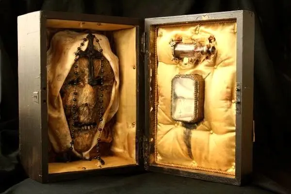 در جعبه چوبی چهار شی پر اهمیت از او نگهداری میشود ؛ بخش جلوی حفظ شده از جمجمه و چهره اش، یک بطری خون او که در یک ظرف شیشه ای نگه داشته شده و در یک برگ طلا قفل موهای او و قطعه رساله دوم او است. خون و پوست مورد تجزیه و تحلیل قرار گرفته و دارای صفات ژنتیکی منحصر به فرد هستند تا اواسط دهه نود، اینها به یک نسل نادر تقسیم شدند.