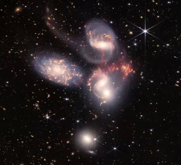 این نما از پنجقلوی استفان را شاید بتوان یکی از بزرگترین و زیباترین تصاویر تلسکوپ جیمز وب به حساب آورد. این تصویر از ترکیب بیش از ۱۰۰۰ تصویر جداگانه ساخته شده است و بیش از ۱۵۰ میلیون پیکسل در دل خود دارد. پنج کهکشانی که در تصویر میبینید با همکاری دوربین مادون قرمز نزدیک و مادون قرمز میانی جیمز وب ثبت شدهاند.