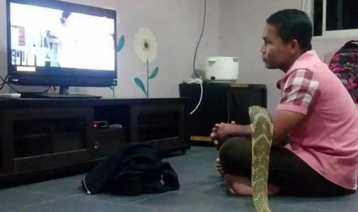 این مرد سنگاپوری هرگز از این مار دور نمی شود و همه جا آن را با خود به همراه دارد حتی زمان خواب. با اینکه افراد زیادی به وی در خصوص خطرناک بودن این مار هشدار داده اند اما او به این حرفها توجهی نمی کند."