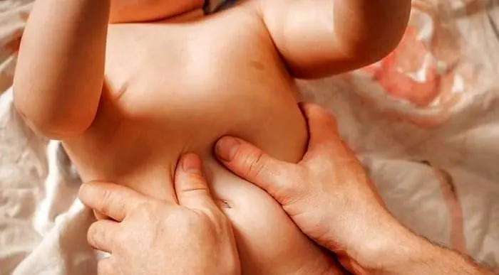 کودک را به پشت بخوابانید ، دست خود را بر روی شکم او قرار دهید . با استفاده از حرکت در جهت عقربه های ساعت ، شکم کودک خود را با حرکات دایره ای بزرگ ،ماساژ دهید . از اشارات کودک استفاده کنید تا میزان فشار لازم را متوجه شوید ، اگر او خشمگین شد یا گریه کرد ، شما بیش از حد فشار می آورید.