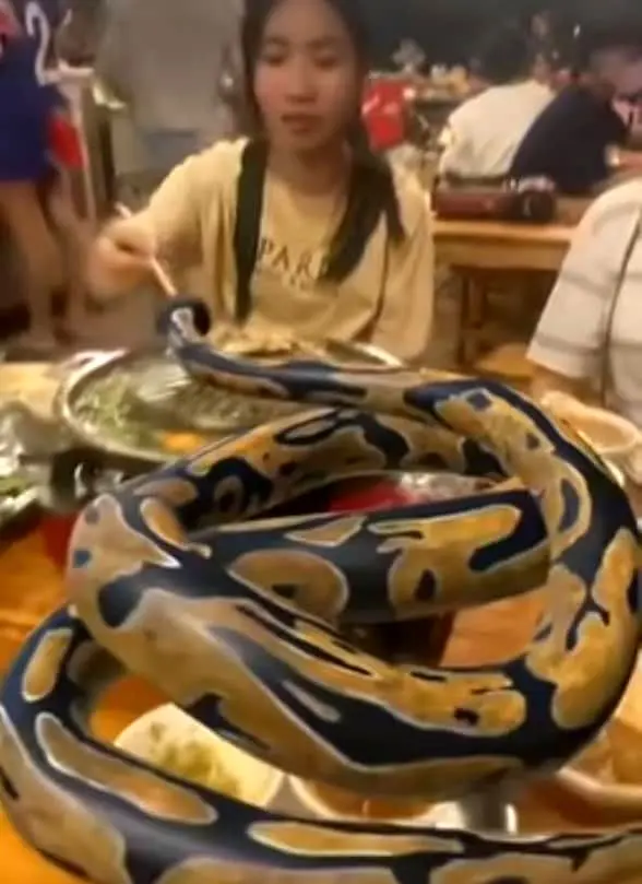 دختری ظاهرا شرقی را میبینید که همراه مار غول پیکر و هولناک پیتون به یک رستوران آماده و همراه او در حال سرو یک شام رومانتیک است. جالب است که این مار خطرناک بطور کامل در کنترل دختر جوان بوده و هر حرکتش با دستور او انجام می شود.