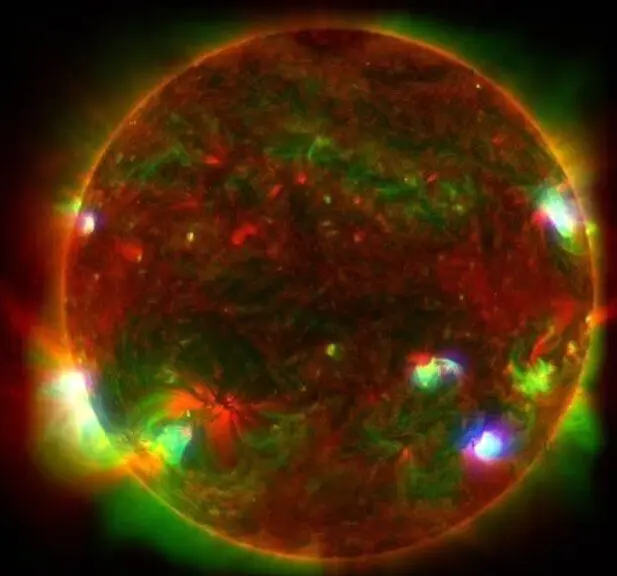 آبی نشاندهنده اشعه ایکس پرانرژی NuSTAR، قرمز نشاندهنده نور فرابنفش SDO و سبز برای پرتوهای ایکس کم انرژی Hinode است.