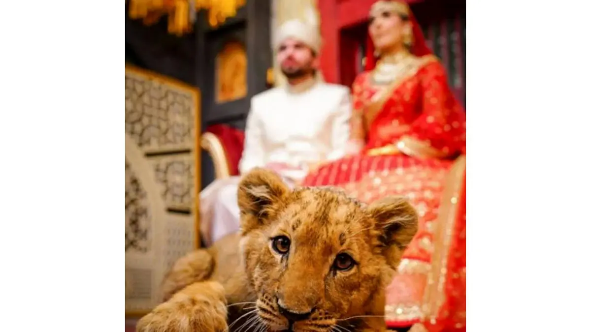 عروس و دامادی برای خاص شدن مراسم ازدواج خود سوار بر شیر به سمت مراسم حرکت کردند.