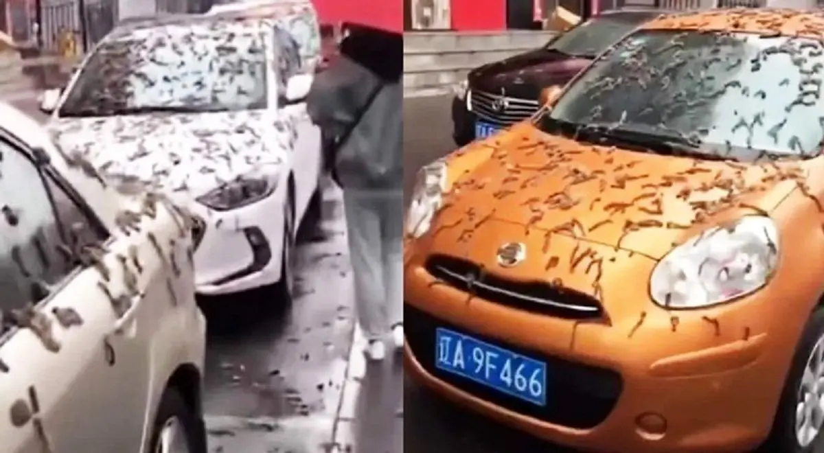در پکن پایتخت چین کرمها بر سر مردم و وسایل نقلیه باریدند. پس از این اتفاق تکان دهنده مسئولان به شهروندان هشدار دادند که هنگام خروج از خانه از چتر استفاده کنند.