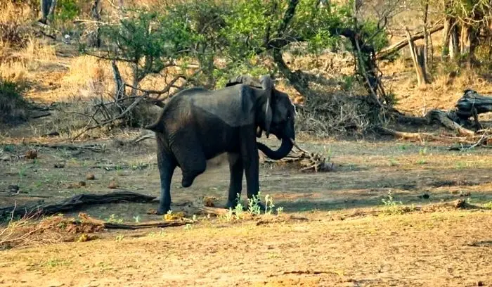 این فیل لنگی قابل توجهی دارد و فقط سه پا دارد. این از دست دادن اندام می‌تواند به دلیل یک دام باشد، یا می‌تواند ناشی از حمله یک شکارچی در سال‌های جوانی او باشد. هر چه که باشد، یک چیز مسلم است: فیل یک بازمانده و نمایشی واقعاً قابل توجه از انعطاف پذیری این حیوانات وحشی با وجود شرایط سخت آن‌ها است.