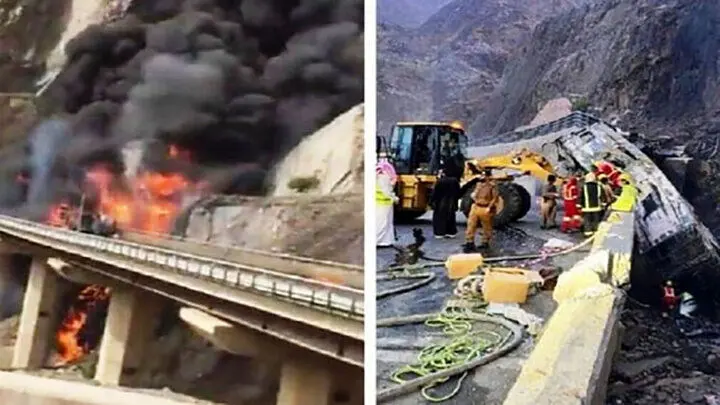 آتش گرفتن اتوبوس زائران در عربستان | ۲۱ نفر زنده زنده در آتش سوختند + فیلم