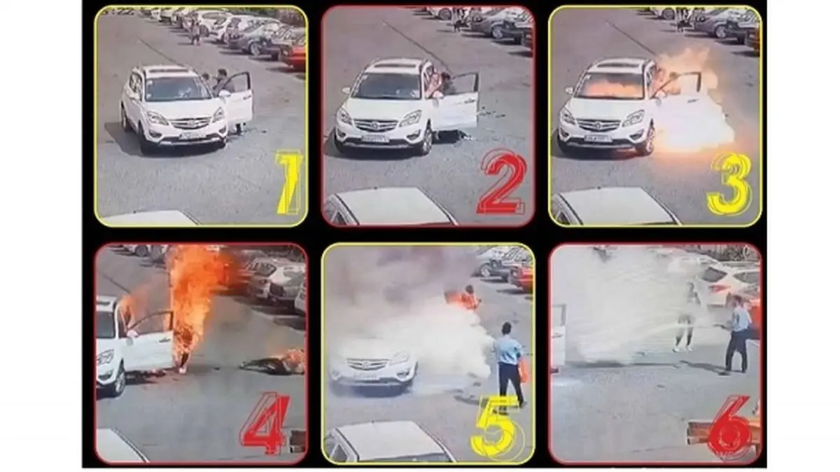 راننده که یک زن جوان است سر تا پا در آتش میسوزد و در اطراف ماشینش میدود. همان موقع یک مرد جوان سر میرسد و با کپسول آتشنشانی اقدام به خاموش کردن آتش میکند.»