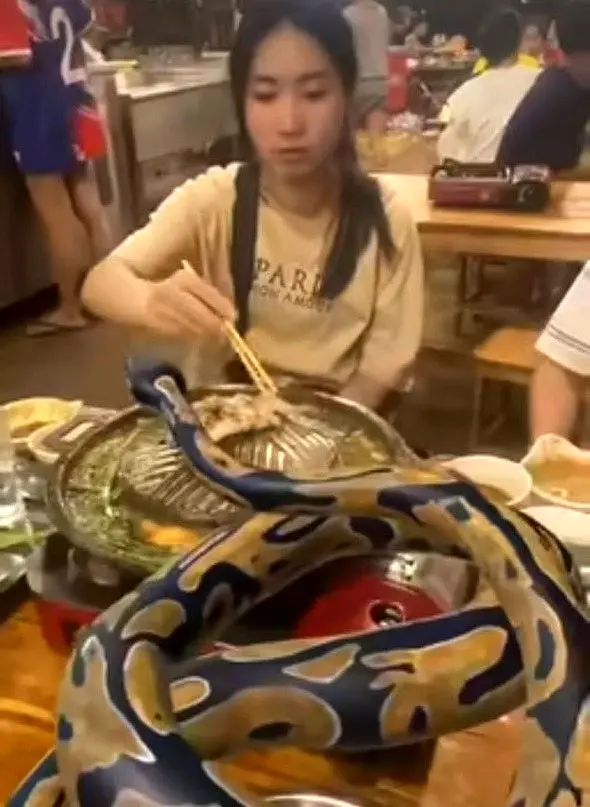 دختری ظاهرا شرقی را میبینید که همراه مار غول پیکر و هولناک پیتون به یک رستوران آماده و همراه او در حال سرو یک شام رومانتیک است. جالب است که این مار خطرناک بطور کامل در کنترل دختر جوان بوده و هر حرکتش با دستور او انجام می شود.