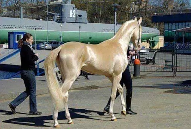 آخال تک اسبی طلایی متالیک و چشم نواز و بسیار زیبا است. گفته می شود این اسب گران ترین اسب دنیا به ارزش 2.5 میلیون دلار امریکا است که در اختیار یک خانم میلیاردر آمریکایی است.این اسب رنگی شبیه گوزن طلایی و درخششی شبیه فلز دارد. از سایر مشخصات ظاهری این اسب می توان گفت که؛ بلند بالا، پوشش موی صاف به رنگ طلایی متالیک، چشمانی بادامی شکل روشن، عضلات شانه ای به سمت بالا ،عقب و بسیار قوی، قفسه سینه دارای فرو رفتگی قوی و زیبا، پاهای کشیده و باریک مناسب برای دو و پرش با مانع، یال و دم نازک و خوش فرم، چربی بدن بسیار اندک و سرتاسر بدن همانگونه که مشاهده می کنید، عضلانی است.