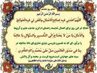 «ای خدا، مرا در این روز به اعمال صالحه راهنمایی کن و حاجتها و آرزوهایم را برآورده ساز. ای کسی که نیازمند شرح و سوال بندگان نیستی، ای خدایی که ناگفته به حاجات و به اسرار خلق آگاهی بر محمد و آل اطهار او درود فرست. »