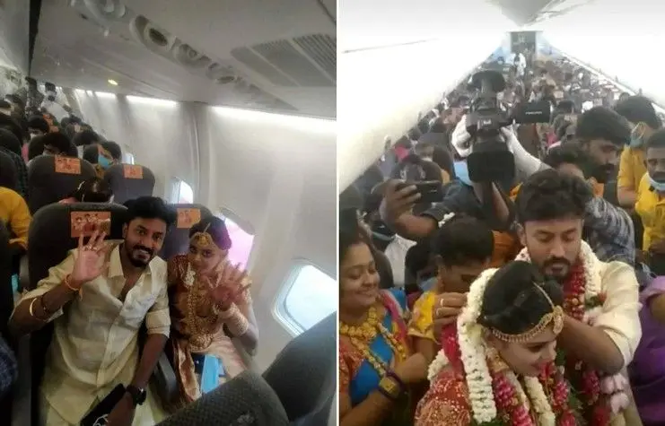 این زوج اهل مادورا در ایالت تامیل نادو در بحبوحه شیوع مرگبار کرونا در هند و محدودیتهای شدید اعمال شده برای برگزاری مجالس عمومی تصمیم گرفتند مراسم عروسی خود را در هواپیمایی که از مادورا به بنگلور پرواز میکرد برپا کنند.