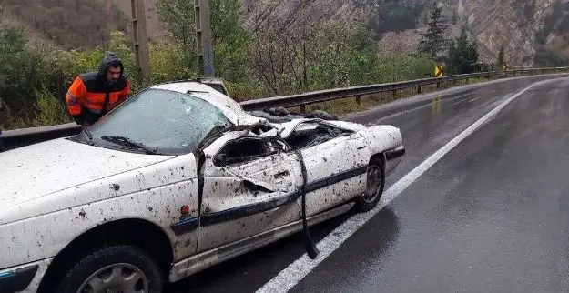 سقوط وحشتناک یک سنگ بزرگ روی پژو پارس در جاده چالوس/ ماشین مچاله شد+ عکس