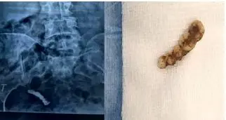 در جریان این عمل جسم خارجی (دندان مصنوعی) با موفقیت از روده عرضی که به طور غیرعادی بلند بود و تا ناحیه لگن امتداد داشت، خارج شد.