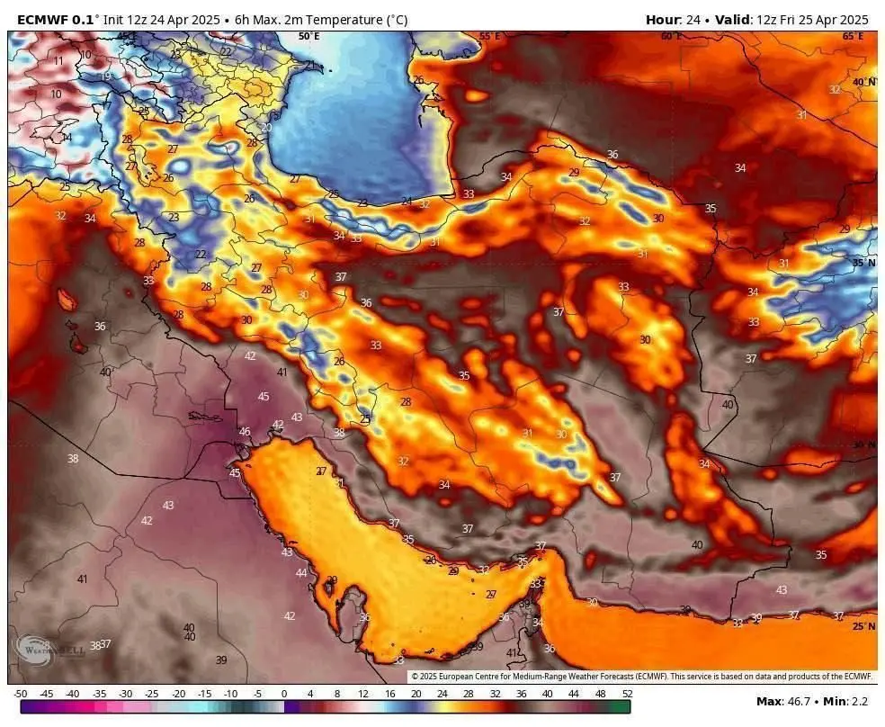 بسیاری از نقاط نوار جنوبی و فلات مرکزی کشور شاهد دماهایی فراتر از ۴۰ درجه سانتیگراد خواهند بود و علیالخصوص در جنوب غرب کشور شاهد دماهایی فراتر از ۴۵ نیز خواهیم بود!