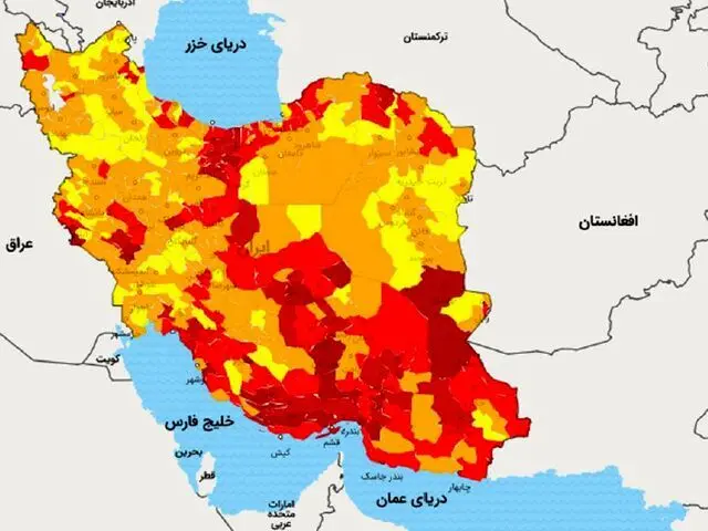 به گفته وی، در حال حاضر ۱۴۳ شهرستان قرمز، ۱۸۶ شهرستان نارنجی و ۱۱۹ شهرستان نیز در وضعیت زرد قرار دارند. بیشترین شهرهای درگیر بیماری شامل کرمان با ۱۶ شهر درگیر، فارس با ۱۳ شهر، تهران با ۱۳ شهر، مازندران ۱۳ شهر، هرمزگان ۱۲ شهر، سیستان و بلوچستان ۱۰ شهر، بوشهر ۸ شهر و یزد ۸ شهر درگیر بیماری هستند. همچنین سایر استان‌ها مانند گلستان و گیلان و همچنین اصفهان بین پنج تا شش شهرشان درگیر است. در برخی از استان‌ها نیز یک یا دو شهر هستند که به سمت تغییر رنگ به سمت قرمز متمایل هستند.