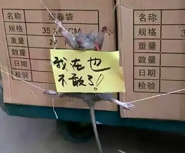 بعد از به دام افتادن موش مرد چینی دست و پاهای موش را بسته و از جعبه های مواد غذایی او را آویزان کرد. پس از این رفتار زشت روی یک کاغذ کوچک پیامی را از زبان موش نوشته و از گردن آویزان کرد.