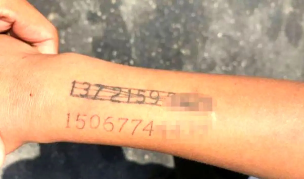 اما همانگونه که مشاهده می کنید،این خانواده گویی تا به حال 2 بار خانه شان تغییر داده اند چرا که 2 بار بر روی ساعد پسر خالکوبی کرده اند که بعد از خالکوبی کردن شماره دوم،شماره اول را با دستگاه مخصوص خالکوبی به نحوی خط زده اند.