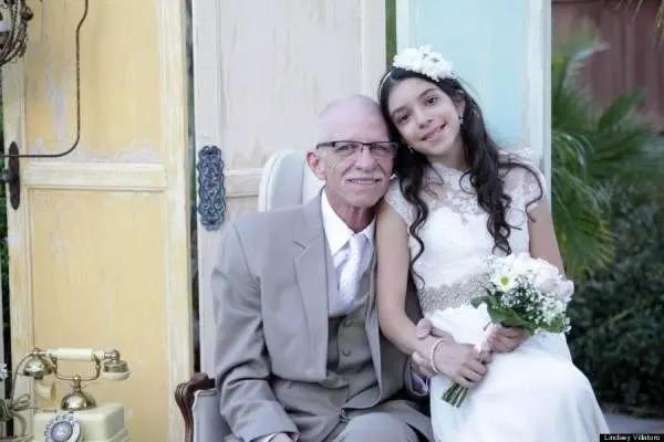 پدر بسیار بیمار یک دختر 11 ساله که می دانست آنقدر زنده نخواهد ماند تا در عروسی دخترش او را همراهی کند بنابراین چند سال زودتر مراسم عروسی را با او برگزار کرد.