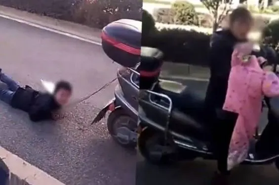 شاهدان تنبیه بیرحمانه مادر چینی نمی دانند چرا او به فرزندش چنین می کند اما بعد از درگیری یکی از رهگذران یا زن جوان او اعتراف کرد که 3 روز است پسرم را با دستان بسته کف خیابان با موتور می کشانم.