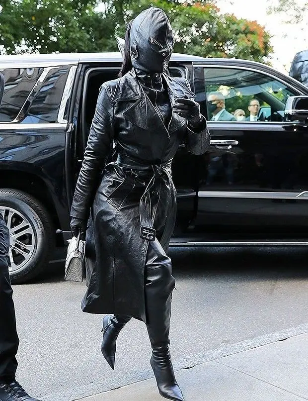" کیم " با پوششی یکدست چرم مشکی وارد محل برگزاری فشن شوی هفته میشود اما آنچه که جلب توجه می کند، ماسک عجیب و به نوعی ترسناک اوست که به صورت کامل چهره اش را پوشانده. ماسک چرم مشکی که در قسمت هایی از آن به عنوان مثال روی چشم ها، زیپ وجود دارد تا احتمالا " کارداشیان " جنجالی بتواند از طریق آنها جلوی پایش را دیده و زمین نخورد.