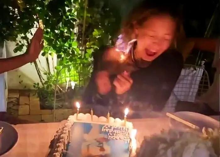 خانم بازیگر برای فوت کردن شمع تولدش کمی خم شد و از آنجا که موهایش از هر دو طرف صورتش آویزان بود، شعله ی یکی از شمع ها به گوشه ای موهایش گرفت. او که غرق در آرزو و فضای فوت کردن شمع تولدش بود متوجه این مسئله نشد تا اینکه یکی از نزدیکانش او را متوجه این اتفاق کرد.