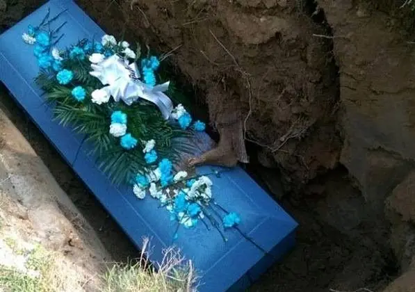 به گزارش منیبان؛ در یکی از قبرستان های نیوجرسی واقع در آمریکا، خانواده عزادار پیرمرد 85 ساله ای، در حال برگزاری مراسم خاکسپاری بودند که ناگهان از درون قبر همجوار، پای فاسد شده ی مرده ای، روی تابوت آبی رنگ پیرمرد ظاهر شد. این صحنه تکان دهنده موجب وحشت بستگان متوفا شد به طوری که دختر این پیرمرد از شدت وحشت به تابوت چسبید.