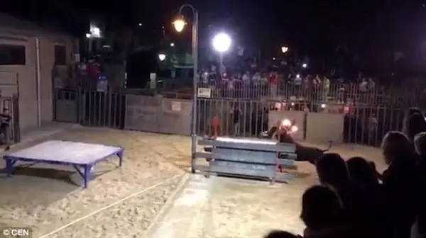 پس از آنکه توپ های آتشین چوبی بر روی شاخ های گاو وحشی گذاشته می شود،گاو وحشی شروع به نگاه کردن به اطراف خود می کند که بطور ناگهان یک زن جوان عکاس از پشت چوب های محل برگزاری برای عکاسی به بیرون از جایگاه خود می آید و گاو وحشی با نهایت سرعت به سمت او حمله ور می شود و زن جوان عکاس را با ضربه دردناک خود به بالا پرتاب می کند.