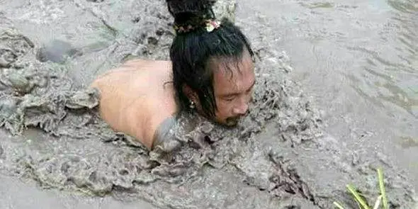 این مرتاض با نادیده گرفتن خطر نزدیک شدن به گل رودها، در یکی از شاخه های رودخانه «اوندا» که در حال حاضر، آب آن به دلیل ورود خاکستر و گدازه های آتشفشانی به رنگ خاکستری درآمده، حمام کرد و کاملا در آن فرو رفت.