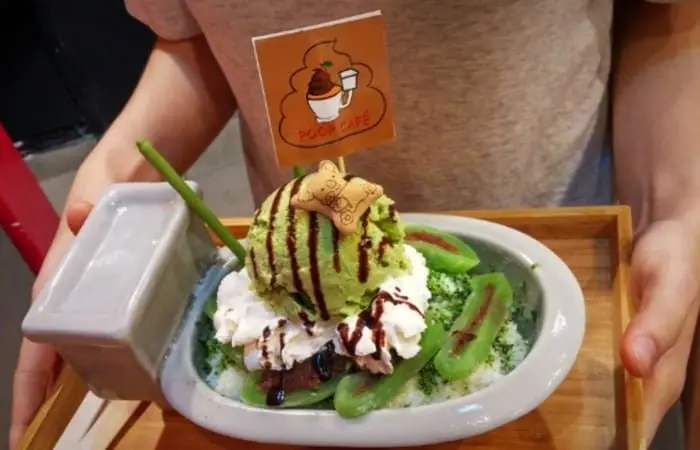 غذا و دسر در کافه پوپ تورنتو به طرز عجیبی برایتان ظاهر خواهند شد، انواع غذا و دسر های شیرین مثل بستنی و کلوچه به طرز ماهرانه ای در کاسه های سرامیکی توالت، فنجان های مینیاتوری ادرار، وان حمام و توالت نشیمن به سبک آسیایی برای مشتریان تزیین میشود. اگر دسر شما شبیه به مدفوع است شوکه نشوید، همه ی این ها برای سرگرمی و شوخی است.