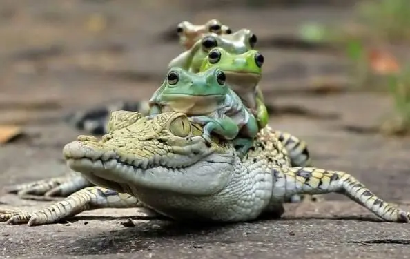 عکس ها و ویدئوهایی که از این اتفاق جالب ضبط شده است نشان می دهد که قورباغه ها یک به یک از کنار بدن کروکودیل به سمت کمر این حیوان خوفناک حرکت می کنند و سواری طولانی از او می گیرند.