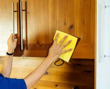 با اسفنج مرطوبی لکهها و اثر انگشتها را از روی وسایل چوبی پاک کنید. اسفنج را فشار دهید تا آب اضافی بیرون بریزد، زیرا درصورتیکه چوب خیس شود باد میکند یا لکه دار میگردد.
