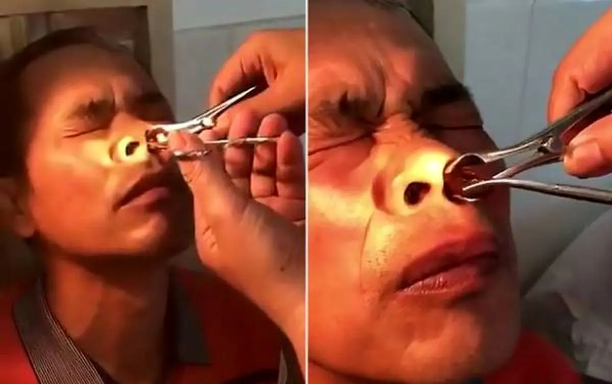 لحظه چندش آور خارج کردن زالوی خونخوار از داخل دماغ مرد مسن/فیلم+18