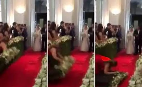 زنی که در تصاویر مشاهده می کنید سعی داشت تا از ورود عروس و داماد به محل مراسم فیلمبرداری کند که یک مرتبه به دلیل تکیه دادن به دیواره های سبز رنگی که با ساقه های گلهای تزیینی ساخته شده بود به قسمت مخصوص مسیر ورود عروس و داماد بیافتد.