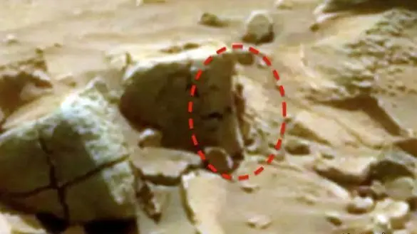 همانطور که در عکس مشاهده می کنید موجود فضایی کنار یکی از صخره های روی سطح سیاره مریخ قرار دارد و سر ، پاها و تنه ی او به طور واضح قابل مشاهده است.