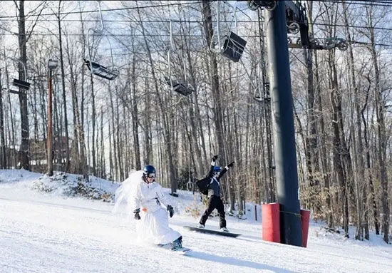 عروس و دامادی تصمیم گرفتند که مراسم عروسی خود را در میان برف و یخ و با بازی اسکی برگزار کنند.