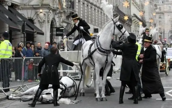 رژه سالانه لندن این بار با سکته یکی از اسب های تربیت شده و مخصوص حمل درشکه برای دقایقی مختل شد ، این حادثه باعث شد که اسبی که او را برای حمل درشکه همراهی می کرد دچار ترس شود و سعی در دور شدن از محل داشته باشد که با کمک مربی خود آرام شد.