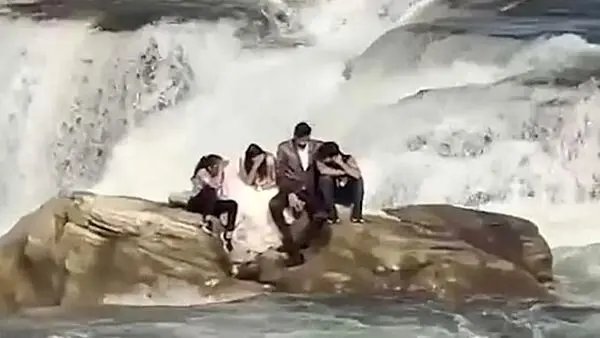 این زوج که برای تهیه تصاویر عروسی خود به یک آبشار معروف رفته بودند به شکلی خطرناک در وسط آب گرفتار شدند. این اتفاق روز سه شنبه و هنگامی رخ داد که چهار نفر از جمله عروس و داماد برای ثبت فیلم و عکس به آبشار «چولیا» در منطقه چیتورگرا واقع در راجاستان هند رفته بودند. یکی از تصاویر منتشر شده این چهار نفر از جمله عروس و داماد نگون بخت را که در وسط آبشار و روی یک صخره بزرگ گرفتار شده اند نشان می‌دهد.