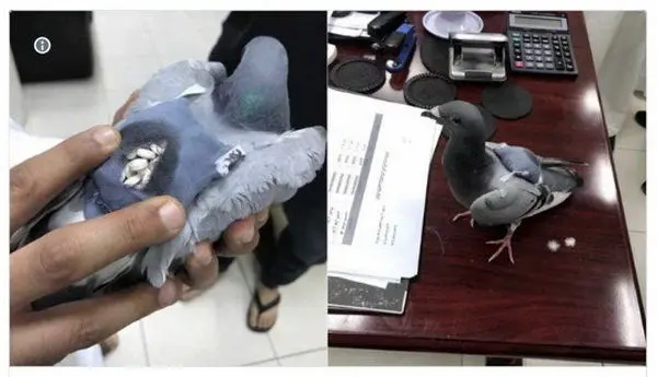 کبوتر حامل مواد مخدر در حالی که در حوضچهای در محوطه زندان مشغول نوشیدن بود، کیسهای به گردنش بسته شده بود.