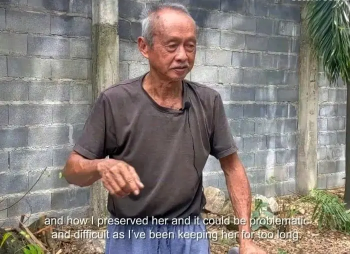 این مرد سالخورده به مدت 21 سال با پیکر همسر مُرده اش که در تابوتی نگهداری می شد، در خانهای کوچک با تنها یک اتاق در بانکوک تایلند زندگی میکرد، همسر این مرد در وزارت صحت عامه سابقه فعالیت داشت و خودش دارای مدرک داروسازی دانشگاه چولالانگکورن بوده و به عنوان پزشک در ارتش سلطنتی تایلند خدمت کرده است.