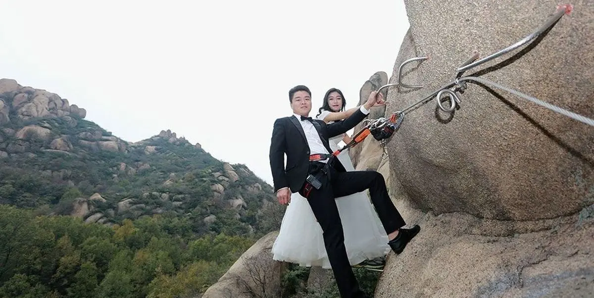 یک زوج چینی در یک تصمیم عجیب از صخره های صعب العبور کوه «زومادیان» در استان هنان چین صعود کرده و روز عروسی شان را جشن گرفتند.