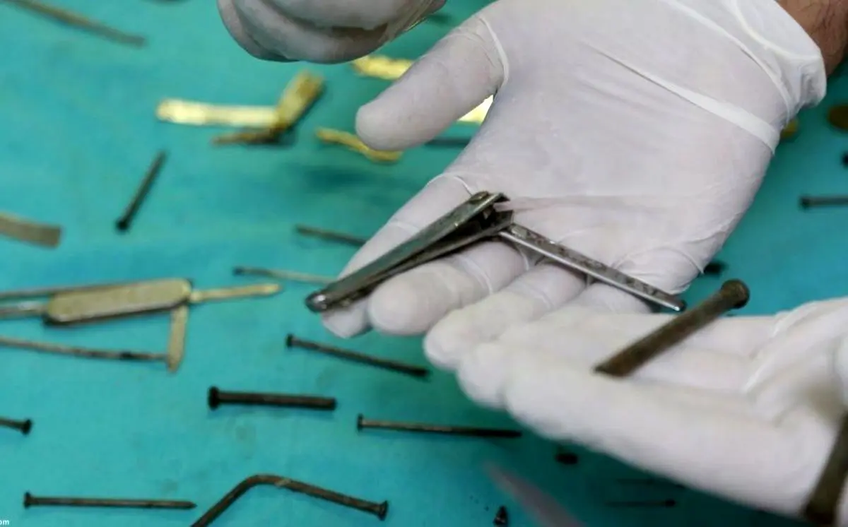ناخن‌گیر، چاقوی جیبی، چاقوی میوه خوری، موچین، میخ، سوزن، پیچ، کلید و سایر قطعات فلزی در معده یک دختر ۲۴ ساله خارج شد.
