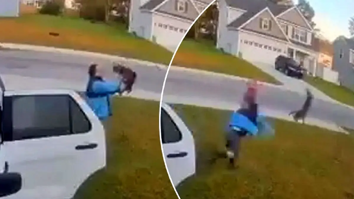 در این ویدئو مشاهده میشود که شوهر این زن بلافاصله به کمک زنش شتافته و این حیوان را از مقابل او گرفته و در هوا نگه میدارد. او سپس در حالی که از شدت ترس فریاد میکشد حیوان را رها میکند.
