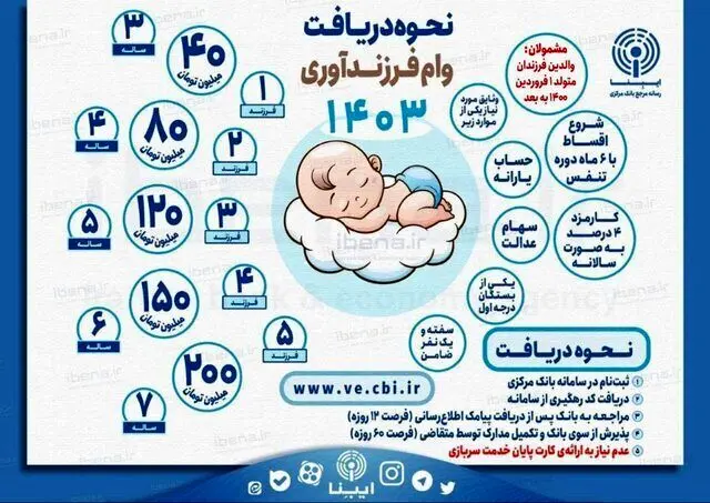 بر این اساس، مبلغ وام فرزندآوری ۱۴۰۳ به‌ازای فرزند اول ۴۰ میلیون تومان (سه ساله)، فرزند دوم ۸۰ میلیون تومان (چهار ساله)، فرزند سوم ۱۲۰ میلیون تومان (پنج ساله)، فرزند چهارم ۱۵۰ میلیون تومان (شش ساله) و برای فرزند پنجم به بعد ۲۰۰ میلیون با بازپزداخت هفت ساله درنظر گرفته شده است.