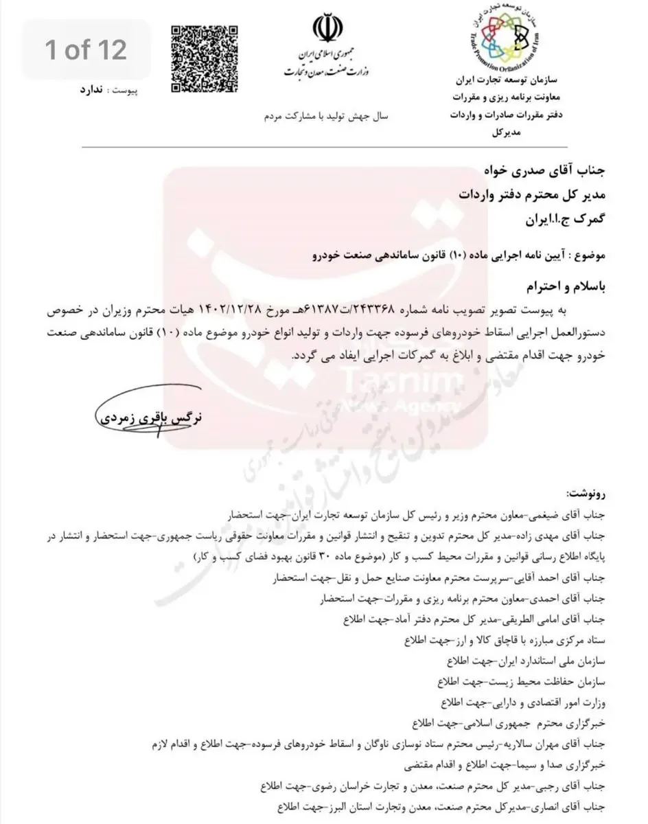 به پیوست تصویر تصویب نامه شماره ٢٤٣٣٦٨/ت٦١٣٨٧هـ مورخ ٢٨/١٢/۱۴۰۲ هیات وزیران در خصوص دستورالعمل اجرایی اسقاط خودروهای فرسوده جهت واردات و تولید انواع خودرو موضوع ماده (۱۰) قانون ساماندهی صنعت خودرو جهت اقدام مقتضی و ابلاغ به گمرکات اجرایی ایفاد میشود.