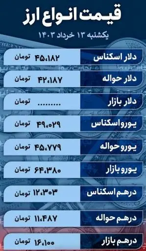 گفتنی است اسکناس دلار و حواله دلار امروز تغییر قیمت نداشت. اسکناس دلار با رقم ۴۵ هزار و ۱۸۲ تومان و حواله دلار با رقم ۴۲ هزار و ۱۸۷ تومان عرضه شد.
