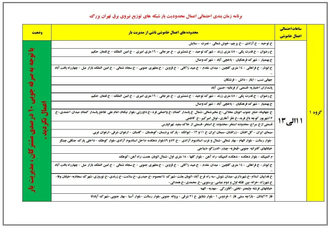 نخستین روز اعمال خاموشیهای تهران جدولی منتشر شد که نشان میداد برق هر محله چه ساعتی خاموش میشود.