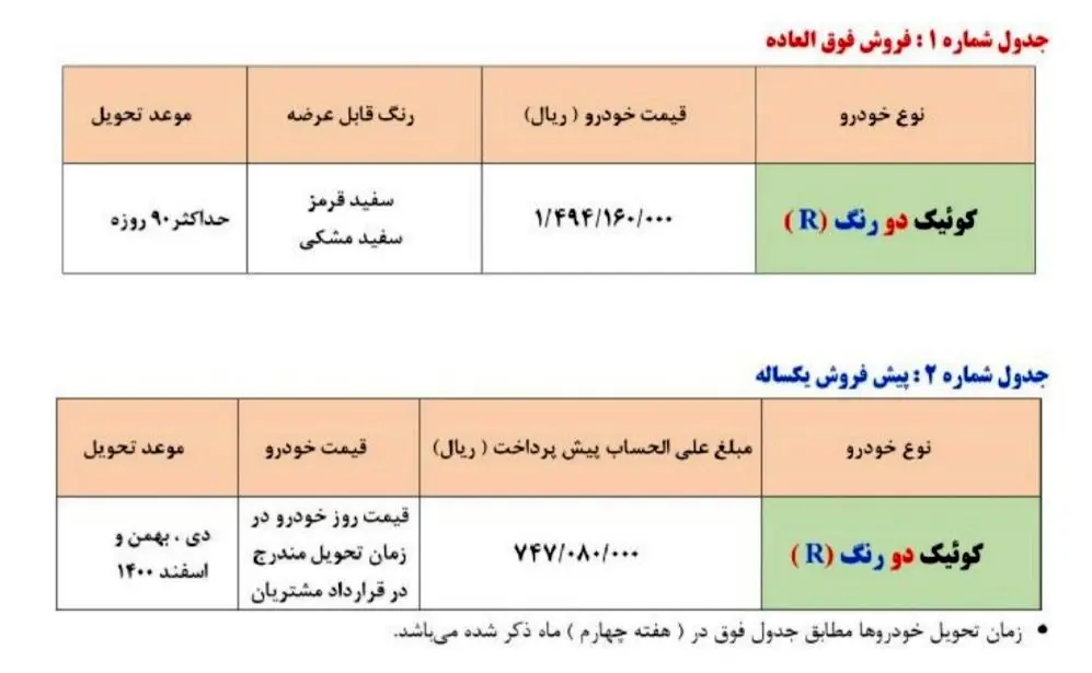 طرح فروش فوق العاده و پیش فروش کوئیک آر (دورنگ) خودروسازی سایپا از فردا چهارشنبه، ۱۶ تیرماه آغاز می شود و متقاضیان برای ثبت نام تا سه روز فرصت دارند به سایت اینترنتی فروش محصولات این گروه خودروسازی مراجعه کنند.