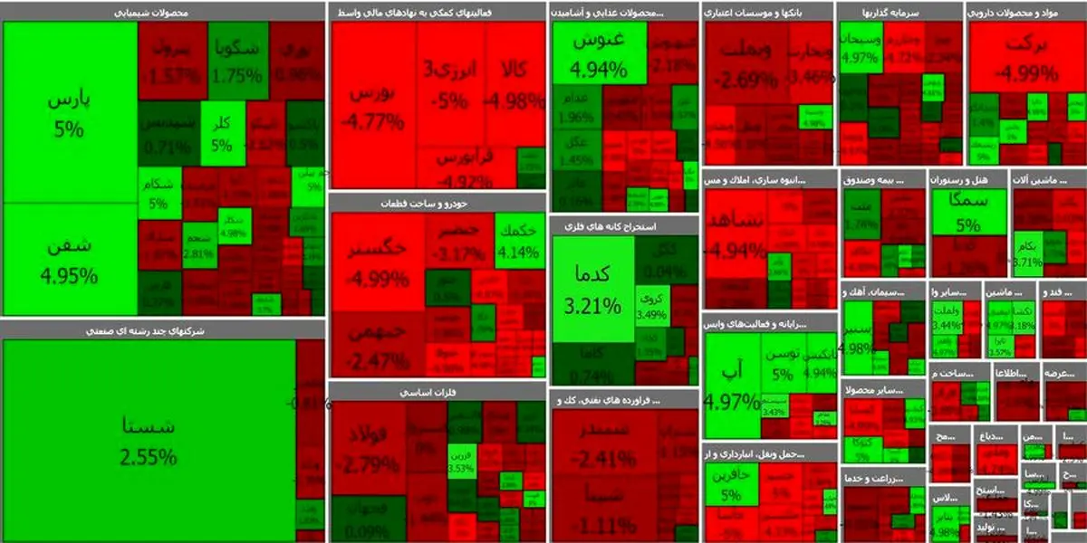 بیشترین بازدهی ها در بورس برای کسرا با 5 درصد و خمحور با 4.98 درصد بود. در فرابورس نماد توسن با 4.98 درصد بیشترین بازدهی را به ثبت رساند. بیشترین کاهش قیمت در بورس برای واعتبار با 4.81 درصد بود. در فرابورس ثتران با 4.6 درصد بیشترین کاهش قیمت داشت.