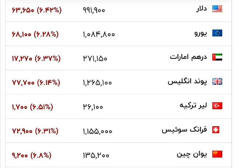 قیمت دلار، یورو، پوند و سایر ارزها امروز پنجشنبه ۶ فروردین ۱۴۰۵ را میتوانید در جدول زیر مشاهده نمایید. لازم به ذکر است که تمامی این نرخها قیمت بازار آزاد است.