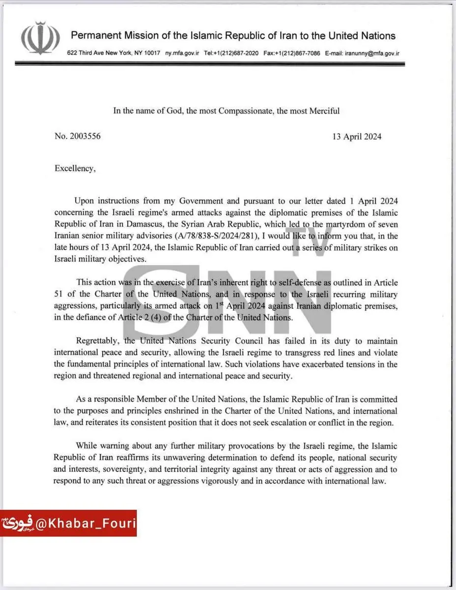 این اقدام در اجرای حق ذاتی جمهوری اسلامی ایران برای دفاع از خود که ذیل ماده 51 منشور سازمان ملل متحد به صراحت آمده، و در پاسخ به تجاوزات نظامی مکرر رژیم اسرائیل، به ویژه حمله نظامی این رژیم در 1 آوریل 2024، که در تناقض کامل با ماده 2 بند 4 منشور بود، اتخاذ شده است. متأسفانه، شورای امنیت سازمان ملل متحد در انجام وظایف خود در حفظ صلح و امنیت بینالمللی کوتاهی نموده و به رژیم اسرائیل اجازه داده تا خطوط قرمز و اصول اساسی حقوق بینالملل را زیر پا بگذارد. چنین تخلفاتی موجب تشدید تنشها در منطقه شده و صلح و امنیت منطقهای و بینالمللی را به خطر انداخته است.